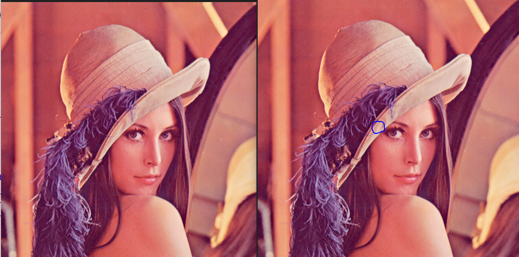 RGB Lena24.bmp에서 (x, y) = (j, i) = (235, 254)의 한 개의 pixel을 white로 filling 한다.