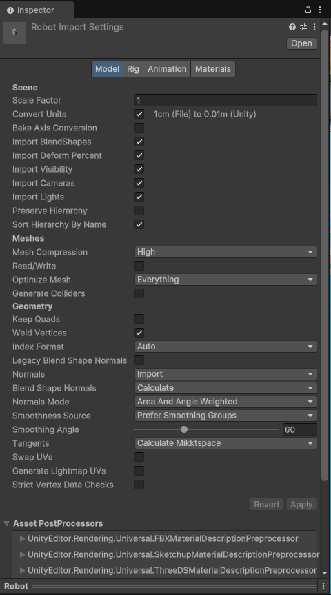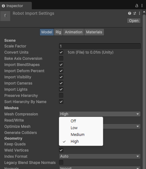 여기선 중간의 Meshes의 Mesh Compression으로 압축을 진행해 준다.